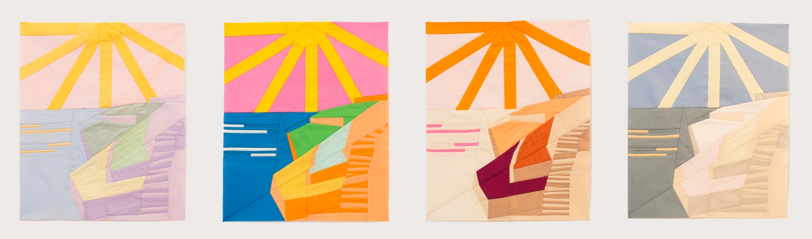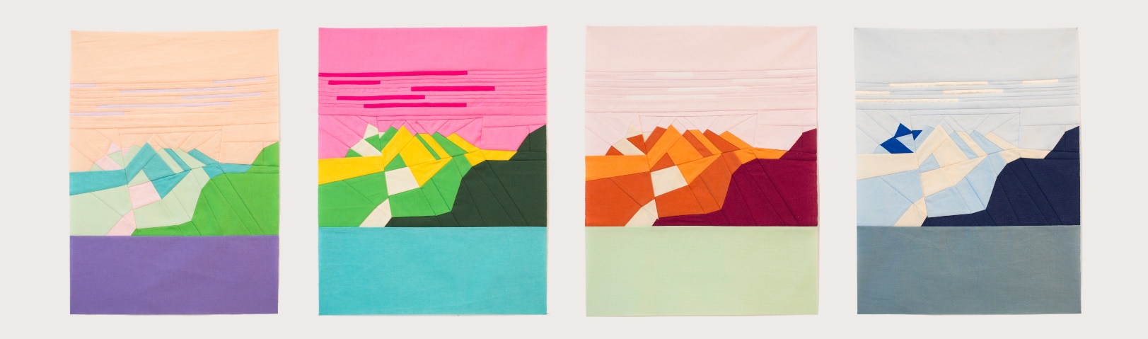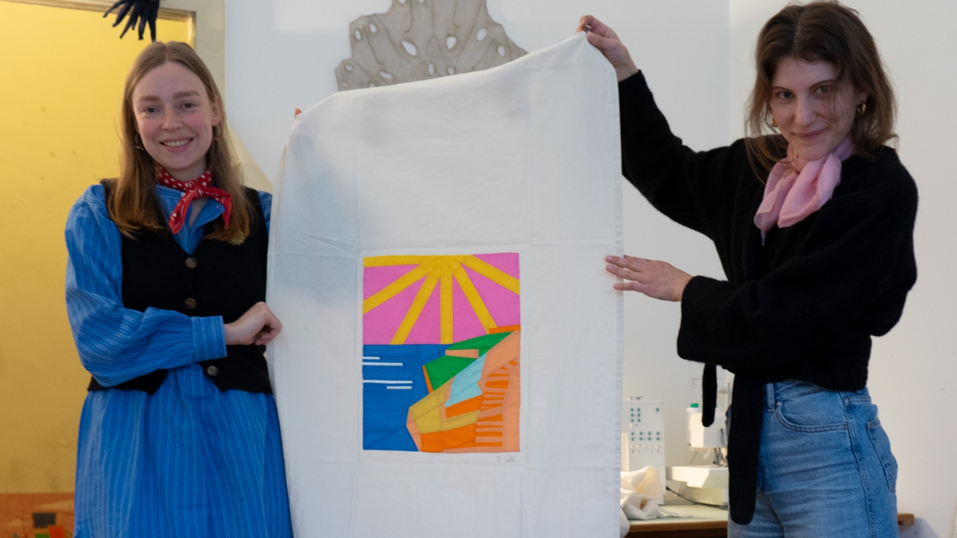 Passant de couleurs flamboyantes à une palette polaire, l’apparente simplicité du paysage est trompeuse, car l’assemblage des morceaux de tissus est un vrai casse-tête. Il a fallu se montrer méthodique: à la machine à coudre, Stéphanie Bircher; aux ciseaux, Emma Lucy Linford. «Nous avons tout fait ensemble, des dessins préparatoires aux coutures finales», relève cette dernière.